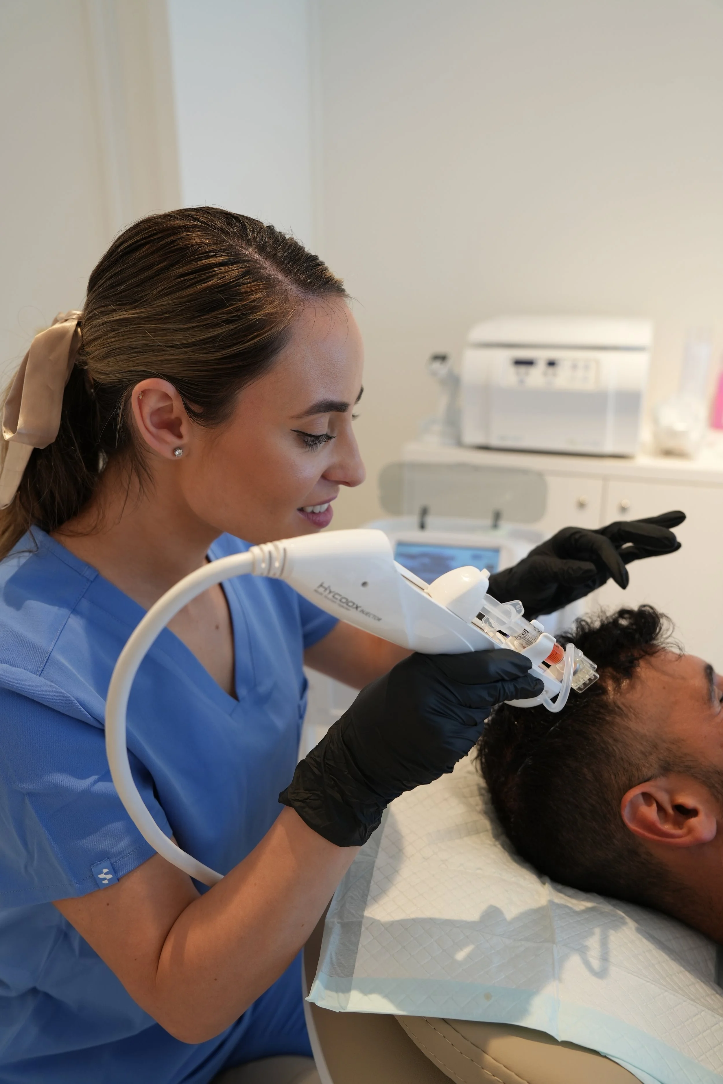 As you can see in the image to the right, the HYCOOX injector is used for the precise injection of platelets into the scalp. This method aims to achieve improved consistency, even distribution of the product, minimal discomfort, and reduced recovery time. The HYCOOX injector is also utilised for PRP skin rejuvenation treatments.